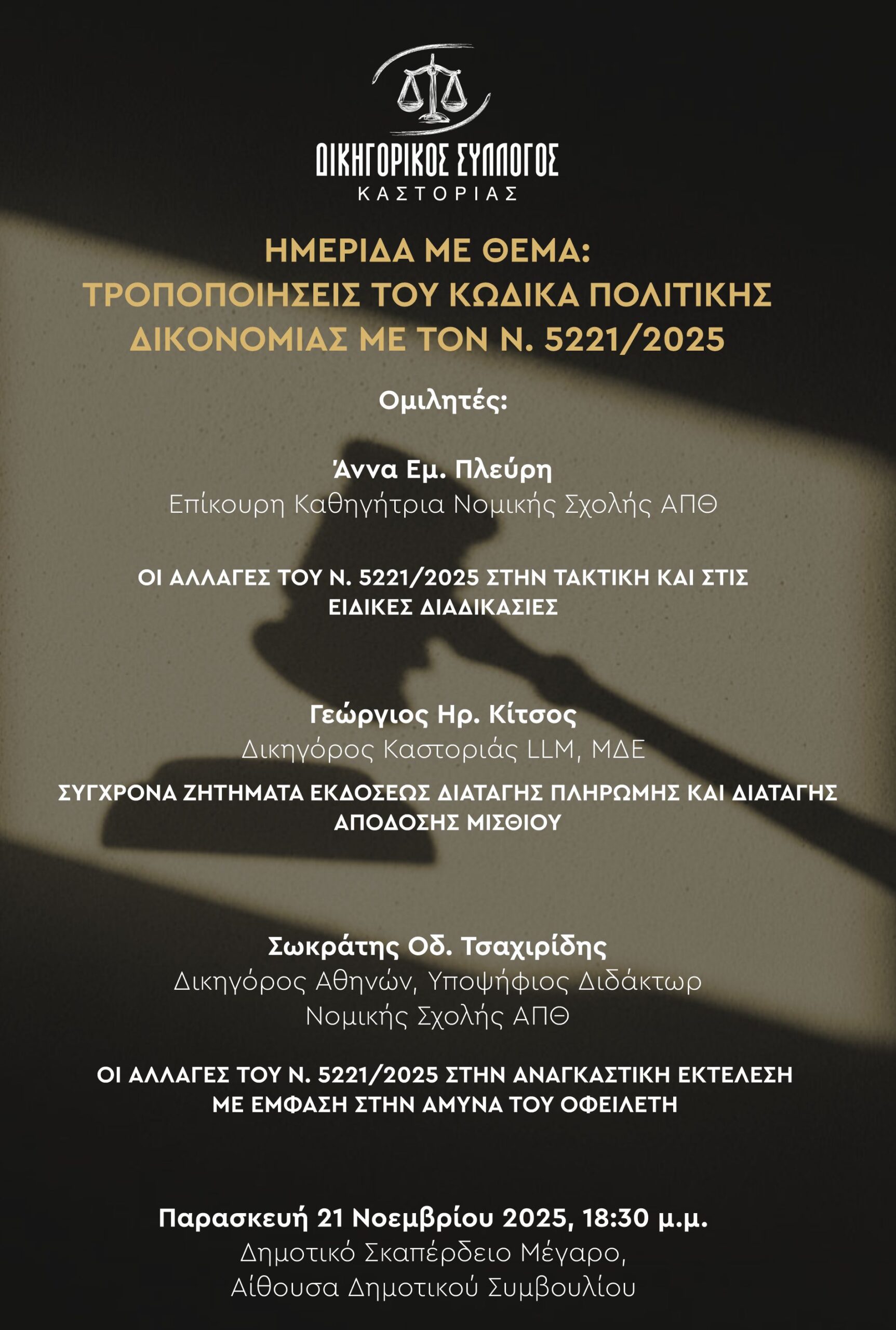 Ο Δικηγορικός Σύλλογος Καστοριάς διοργανώνει και σας προσκαλεί σε ημερίδα Πολιτικής Δικονομίας, με θέμα τις εκτεταμένες τροποποιήσεις στον Κώδικα Πολιτικής Δικονομίας, που θα ισχύσουν από 01.01.2026.-